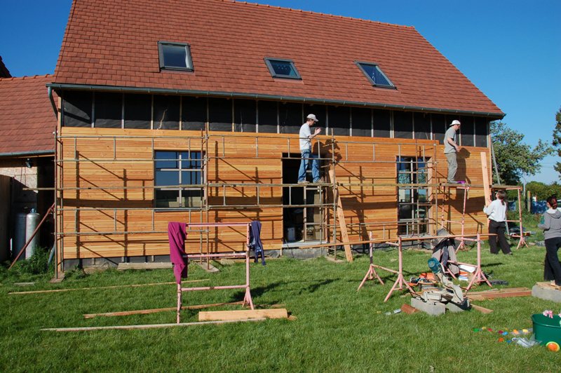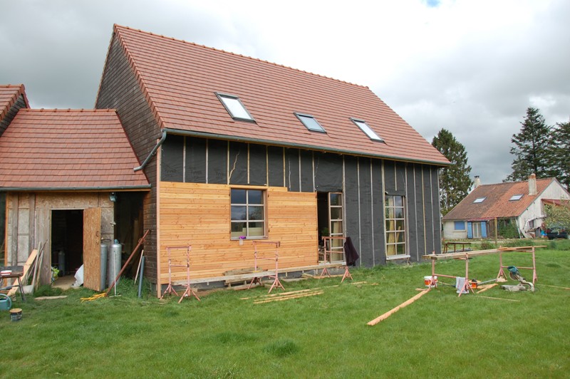 ce week end on a profité des renforts (Alex et Nono) pour entamer le bardage coté jardin, histoire d'avoir un mur un peu plus présentable pour le mariage. Résultat on a quand même réussi a passer par dessus la première fenetre. Bon après j'ai été bloqué pour continuer, fallait qu'on habille la première porte fenetre pour pouvoir continuer, et entamer ce genre de chantier a 17h bah euh ... hein ... enfin bref. on a bien avancé aussi sur l'escalier, on a réussi a faire la moitié. la suite viendra quand on aura taillé le limon du bas. bah voui s'pa facile de fixer les marches dans le vide. la suite le week end prochain.