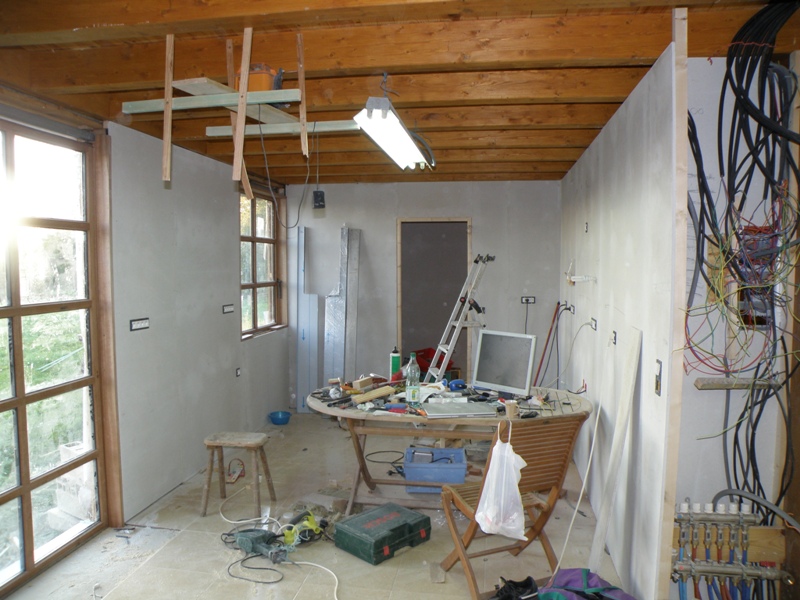 Pendant que le chef s'escrime a tailler de belles pièces pour l'escalier, je me suis attaqué a l'enduit de lissage du rez de chaussée ... et c'est pour ainsi dire quasiment terminé. au jour d'aujourd'hui (j'adore cette expression qui veut rien dire), il me reste juste un mur de la cuisine a enduire. On a aussi profité du printemps pour déplacer le chêne qui était au bord de la mare, vers le fond du jardin. Bon en deux coups de tractopelle c'est vachtement rapide. c'est a peu près tout ... ah si tiens, une petite photo des marches en cours de fabrication