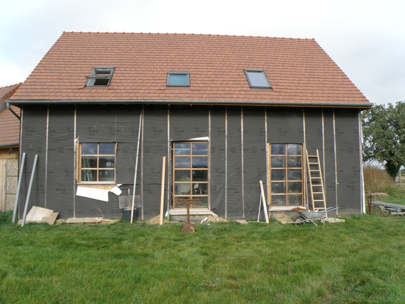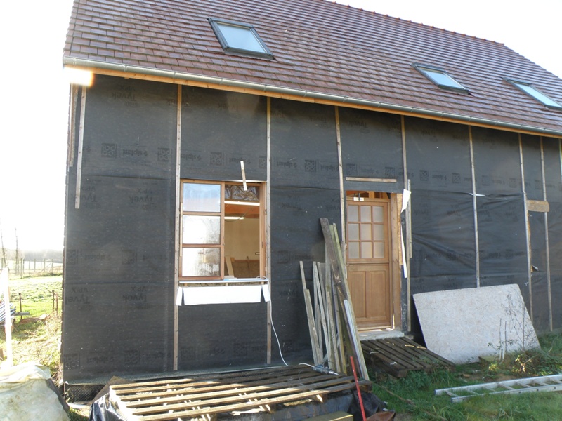 bon alors rassurez vous, on a un peu bossé pendant ces deux mois quand même. les portes fenetresdu pignon ont étés posées, ainsi que le fermacel des cloisons. du coup on a attaqué les fenetres de la façade. celle de la salle a manger est posée complètement ainsi que les cloisons jusqu'a la superbe porte qu'on a acheté la semaine dernière. Une belle porte fermière qu'on a trouvé sur le boncoin a 170 euros... économies quand tu nous tiens et donc aujourd'hui on a quasiment posé la fenetre du bureau, mais il nous manquait les planches pour faire les appuis de fenetres. du coup le week end prochain on finit le bureau, et après on attaque la salle de bain une fois que la salle de bain sera fini on va ramener le combiné bois dans le garage et on attaque l'escalier. il faudra aussi qu'on pense a démarrer la chaudière provisoire qu'on a installé histoire de chauffer un peu la maison. je vous laisse voguer dans les galeries photos, si vous cherchez bien vous verrez même que les toilettes a l'étage sont finies. une jolie photo de la facade prise hier: