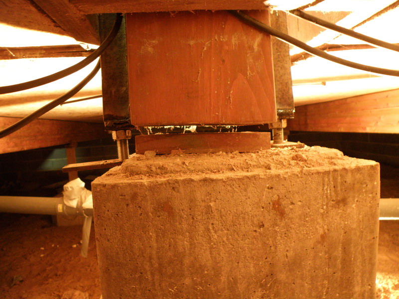 et voui c'est un titre évocateur aujourd'hui, on a commencé les cloisons !!! bon, avant de commencer, il a fallu remonter un peu le plancher de l'étage, parce que ça c'était un peu tassé d'un cm (on soupçonne que ça ce soit tassé dès le départ ^^). Du coup l'ingénieur en chef a fabriqué un système pour lever le poteau central, afin de remonter la poutre qui soutiens l'étage. Le plus compliqué a été de descendre dans le vide sanitaire et de marcher courbé sur les genoux ... mais bon le système a fonctionné, et on a pu mettre la première plaque de cloison :) La suite un autre jour. une petite image du super système de levage de poteau