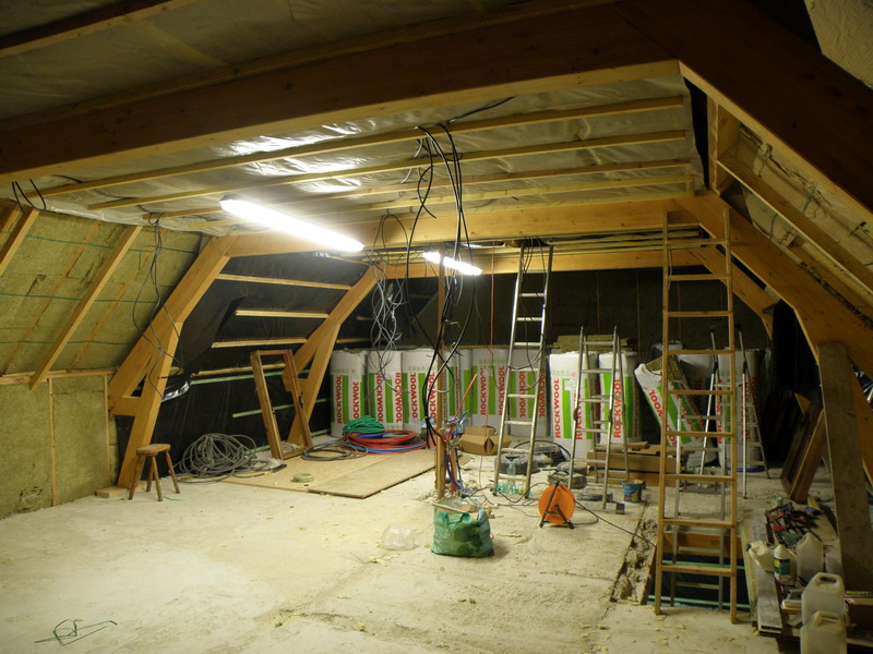 Ce week end, on a profité de la nouvelle année et du beau temps qu'il faisait pour compléter un peu l'isolation de l'étage (cette phrase n'a en fait aucuns sens mais tant pis). Le problème c'est qu'on a oublier de racheter du pare vapeur, et on a pas pu finir les murs :D pas grave, vu qu'on avait fini le plafond, on c'est dit qu'on allait faire un peu d'electricité :) on a donc passer tous les cables qui serviront pour l'eclairage des différentes pièces de l'etage. Bon evidemment faut imaginer hein, la y'a que des fils qui pendent :) je vous laisse admirer tout ça dans la galerie. une petite photo des fils qui pendouillent