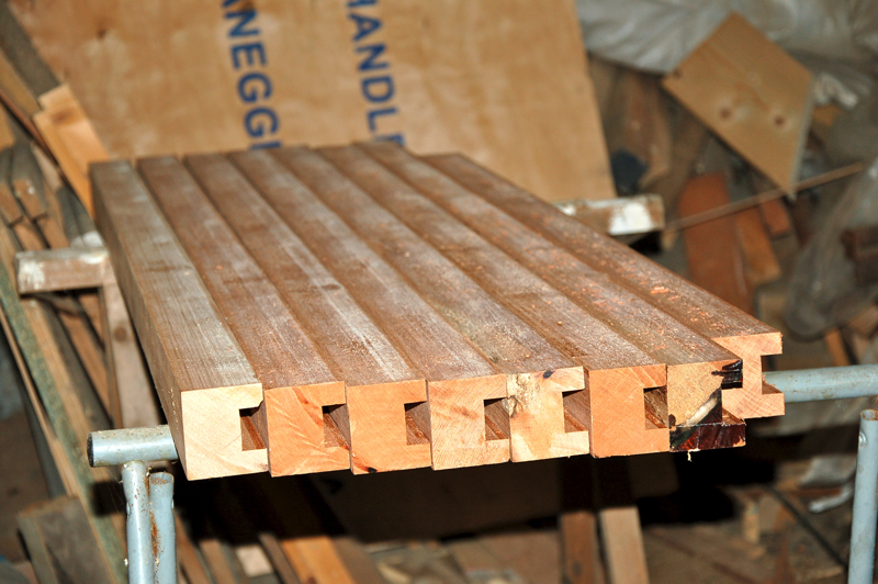 ce week end c'etait encoooooore menuiserie, du coup on a fini le chantier collage, et on c'est attaqué a l'usinage des profils des barreaux et montants de fenetres ... je sais pas si c'est comme ça qu'on dit exactement, mais on a chanfreiné velu :D la ptite photo qui va bien