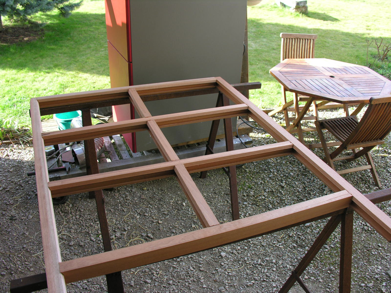 bon ce week end, on c'est dit que pour changer on allait faire de la menuiserie :) comme on avait fini d'usiner les bouts de bois, on a commencé l'assemblage. on a fini les deux portes fenetres du coté jardin de la maison, et on a fini deux pitites fenetres ^^ ils nous reste des ptites rainures a faire pour placer les joints exterieurs et ça devrait etre pas mal. manque une chose ... ah bah oui les carreaux :D la ptite photo du chef :)